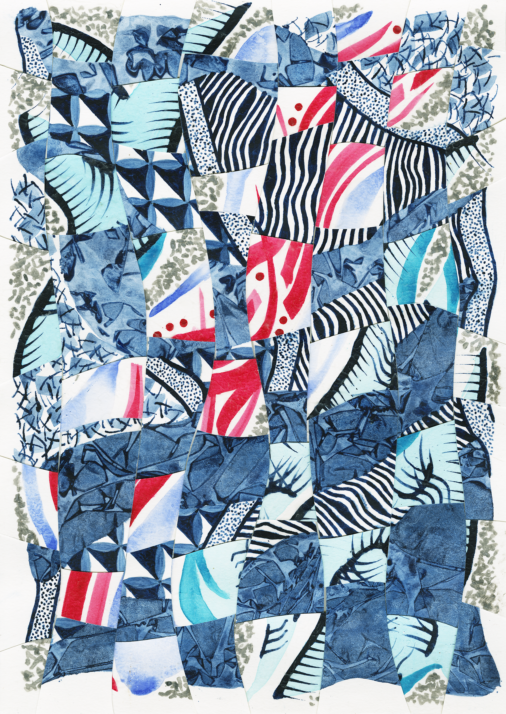 2 watercolor artworks cut & 'woven' together in an attempt to explore different brushstrokes & methods of applying pigment to paper; these composite artworks were then digitally scanned